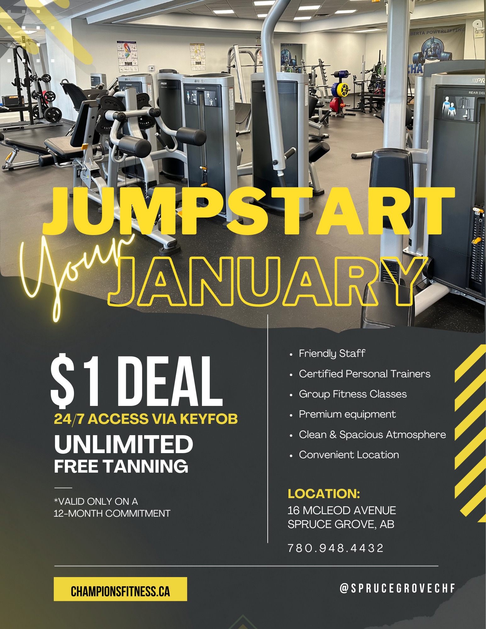 Welcome to Spruce Grove Champions Health & Fitness Check out our New Years Promo, the Spin Studio, Precor Chest Press and Glute Drive Machine Check us out on Facebook for any updates by clicking here