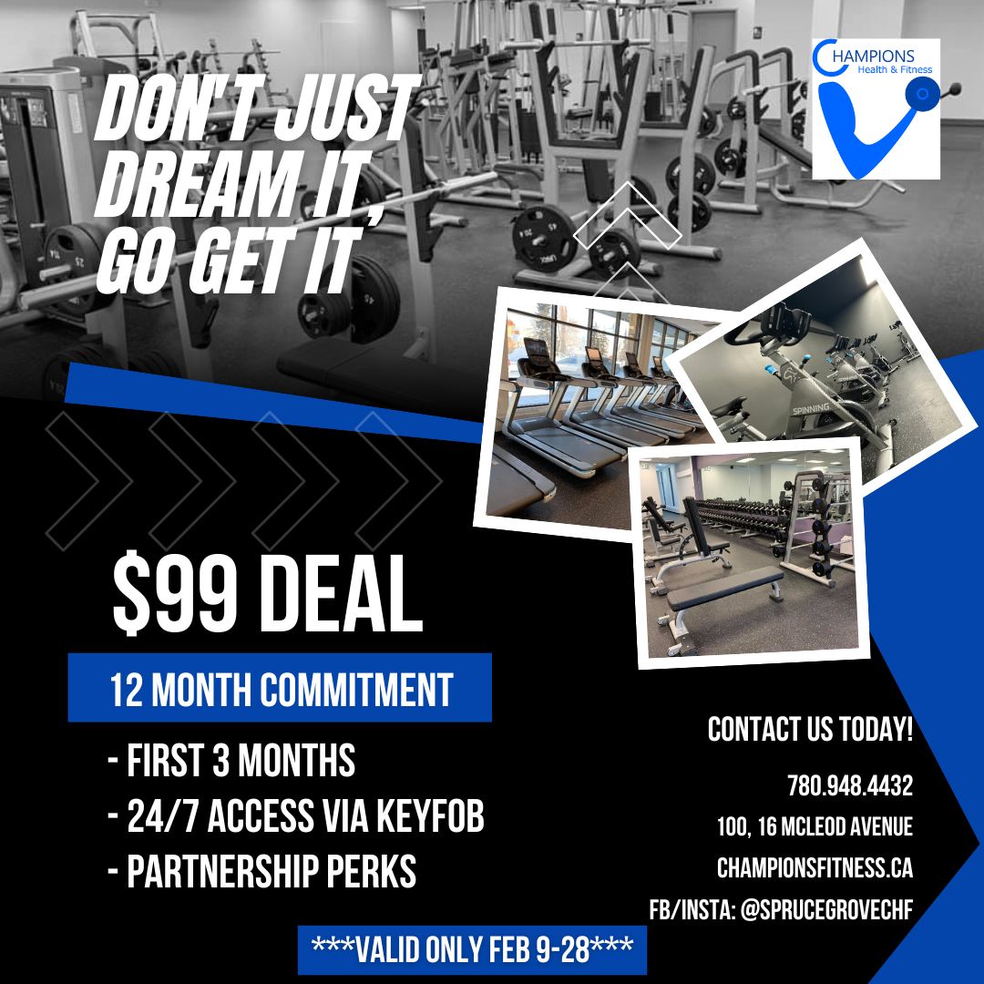 Welcome to Spruce Grove Champions Health & Fitness Check out our February Promo, the Spin Studio, Precor Chest Press and Glute Drive Machine Check us out on Facebook for any updates by clicking here